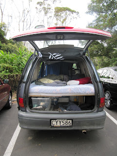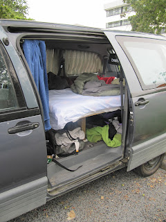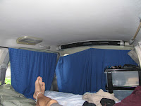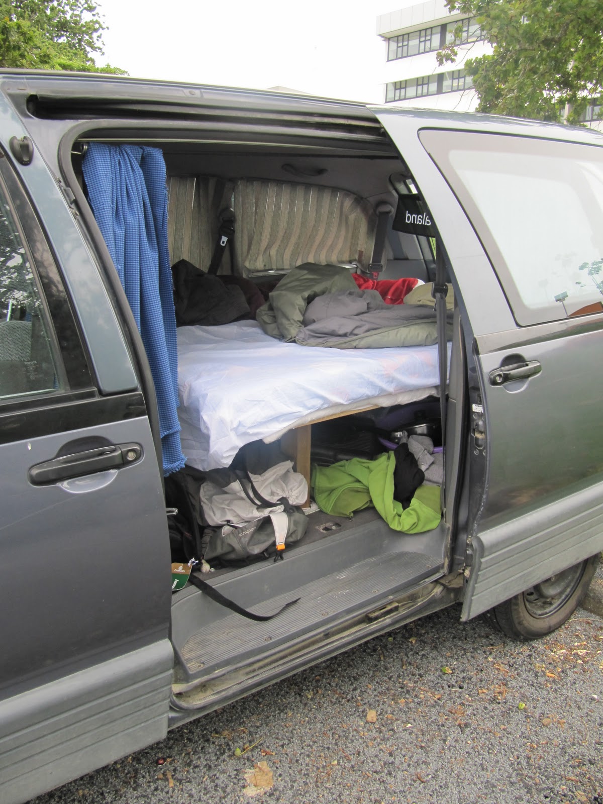 C’est un van tout équipé pour les voyageurs comme moi. C'est-à-dire qu’il y a déjà de quoi faire bouffer, un table démontable, des chaises, une gazinière, des tiroirs de rangements, un lit !, 2 coussins, une glacière, même une canne à pêche, une combinaison et puis d’autres trucs que je n’ai pas eu le temps de découvrir….
